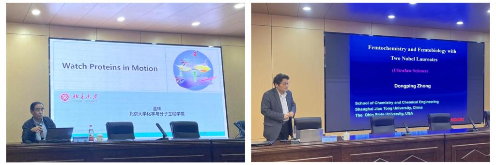 仲冬平在题为《Femtochemistry and Femtobiology with Two Nobel Laureates》的报告中,以飞秒光谱技术探究碘苯中C-I键断裂后分子的运动形态为例,详细介绍了飞秒光谱在化学反应中的作用机制。随后通过皮肤癌的发病原因引出存在于自然界爬行动物体内的光解酶,重点讲解利用飞秒光谱和分子生物学技术揭示避免皮肤癌产生所需的DNA修复光周期以及分子机制的策略,为治疗皮肤癌的药物、防晒化妆品成分的设计等潜在应用提供了分子基础,并向同学们介绍了诺贝尓奖获得者的科研经历、学术态度和卓越成就。