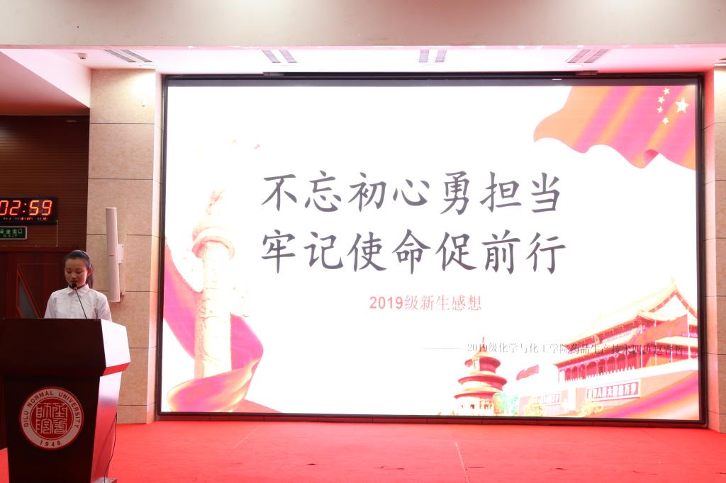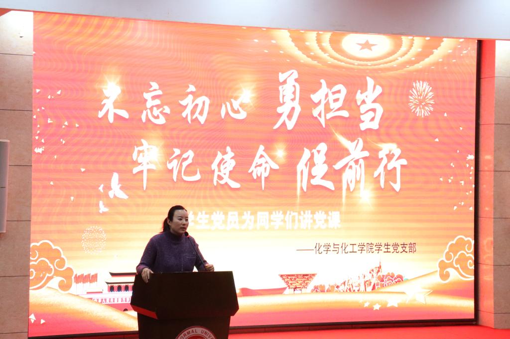 随后,学生党员代表依次发表讲话。杨莹围绕“志存高远,责任为先”强调学生干部要有担当、有作为,并且要以积极的态度和饱满的热情投身实践;赵钦国以“守初心,担使命”为主题激情洋溢地讲述了新一代青年应该担当的时代使命,并且建议同学们在大学生活中“找准定位,发挥价值”;郭艳慧从介绍自己与党的缘分开始,讲述了大学生如何热爱国家、心系祖国,用自己的“青年梦”托起国家的中国梦。