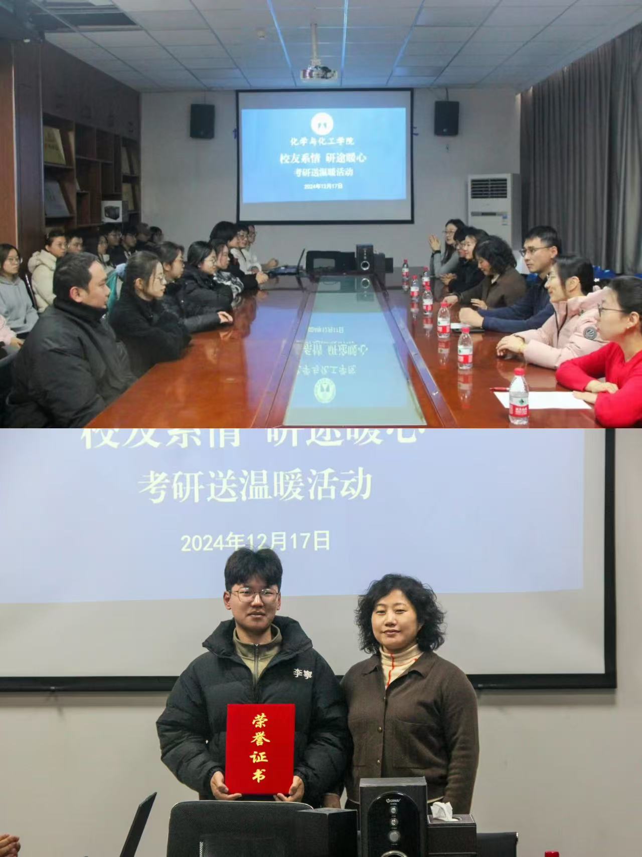 2025年全国硕士研究生招生考试临近,考研学子们已进入紧张的冲刺阶段。为加强学风建设,增强考研学子的信心与动力,12月17日,学院在二号实验楼B310开展“校友系情,研途暖心”考研送温暖活动。学院院长曹晓荣,党委书记巩磊,团总支书记杨睿,济南齐美文化传播有限公司总经理、2019级校友周长龙,毕业班辅导员代表吕文静,班主任代表董坤参加活动。他们为考研学生送上饱含心意的祝福礼包,传递学院对学生成功上岸的诚挚祝愿。