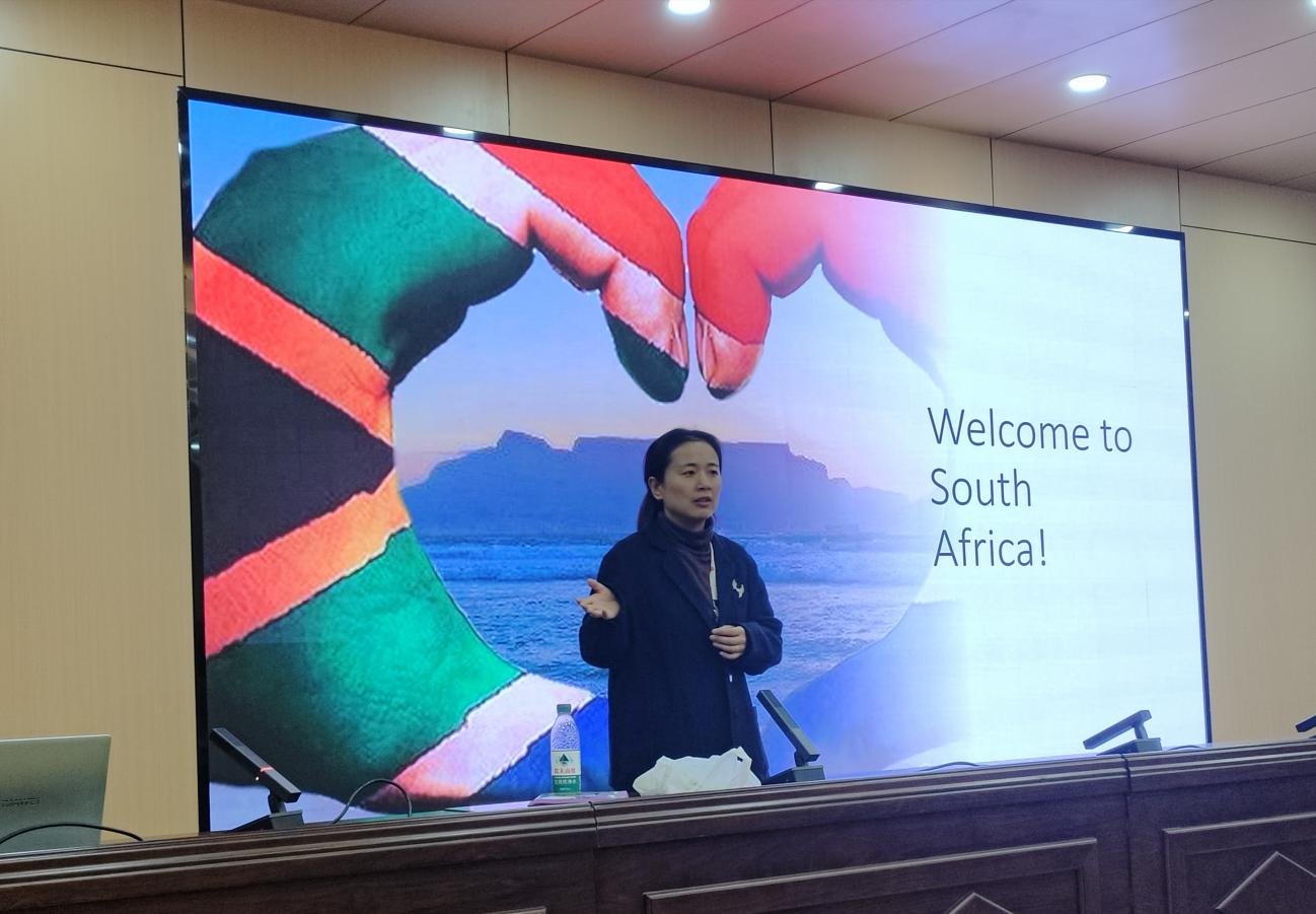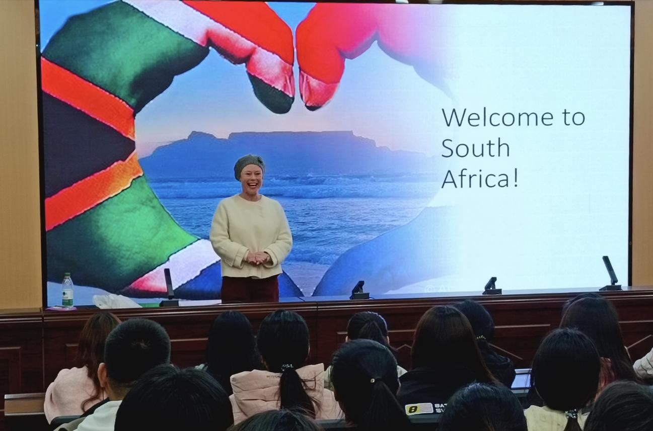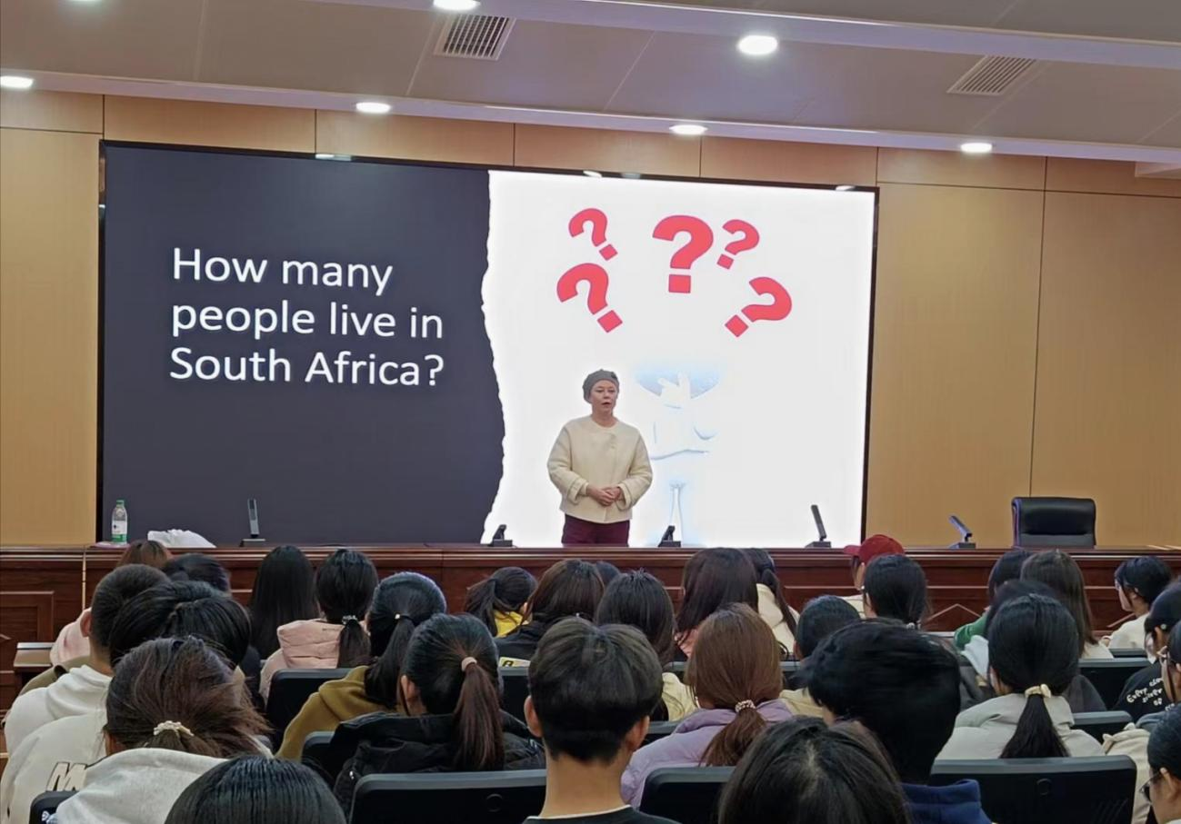 Rita教授从极具特色的饮食习惯、动物习性、首都建筑、官方语言等方面,详细介绍了她的祖国--南非。她流利的发音、自然的语调让同学们体会到英语口语的魅力和浓郁的异国风情,她丰富的求学经历和人生阅历,激励在场的同学脚踏实地,坚持不懈,努力追求自己的梦想。同学们被Rita教授的热情所感染,通过语言和肢体动作,积极踊跃地与她互动交流,既加深了相互了解,又活跃了现场气氛。