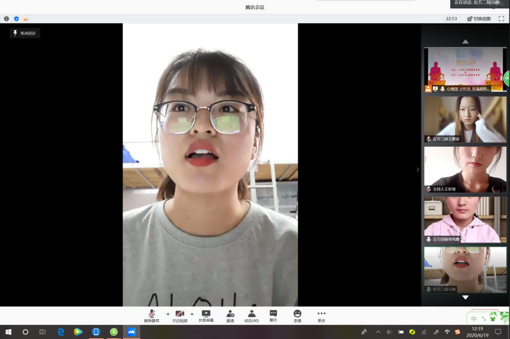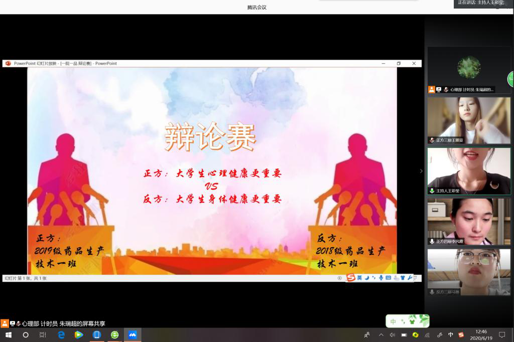 为了做好新冠肺炎疫情常态化防控形势下的心理健康教育工作、缓解同学们疫情期间在家的心理压力,6月19日12:00,我院于腾讯会议APP上举行了以“‘辩’于青春,从‘心’开始”为主题的辩论赛。本次辩论赛的辩题为大学生是心理健康重要还是身体健康重要。2019级药品生产技术一班担任正方辩手,2018级药品生产技术一班担任反方辩手;我院辅导员老师,院学生会心理发展部成员及2018级、2019级心理委员担任本次大赛的评委。