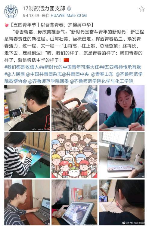 5月4日,我院同学们在微博、微信各媒体平台参与#五四青年节#、#五四精神传承有我#、#让青春为祖国绽放#、#我们都是收信人#等热门话题,谈理想、话担当,同全国各地青年共同庆祝青年节日,共同传承五四精神。
