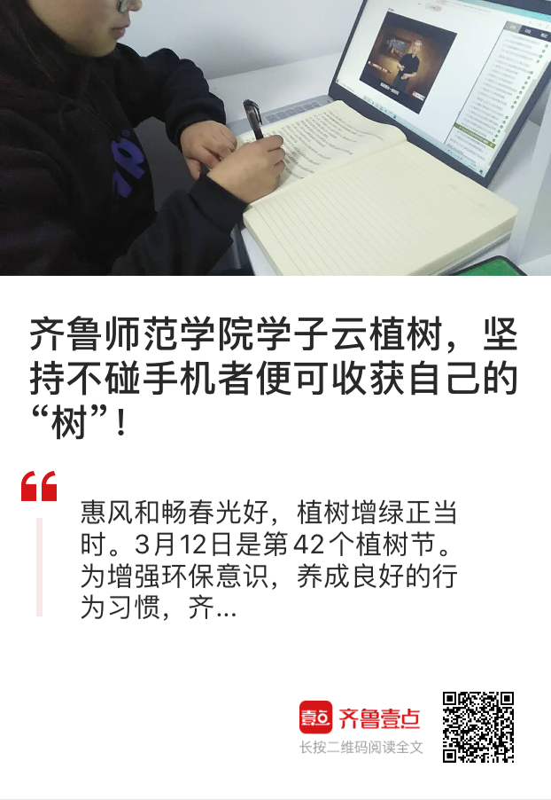 当前,受疫情影响,我们无法出门亲手种下一棵树,我院学生通过“云植树”这样的方式,发扬爱树、植树、护树的优良传统。习近平总书记曾指出,植树造林是实现天蓝、地绿、水净的重要途径,要坚持全国动员、全民动手植树造林,努力把建设美丽中国化为人民自觉行动。“前人种树后人乘凉,我们每个人都是乘凉者,但更要做种树者”,不论是践行绿色发展理念还是养成良好行为习惯,都是如此。本次活动将持续进行下去,同学们将通过本活动进一步树立生态文明的意识与观念,养成好习惯、树立新风尚。齐鲁晚报·齐鲁壹点已对此活动进行报道。