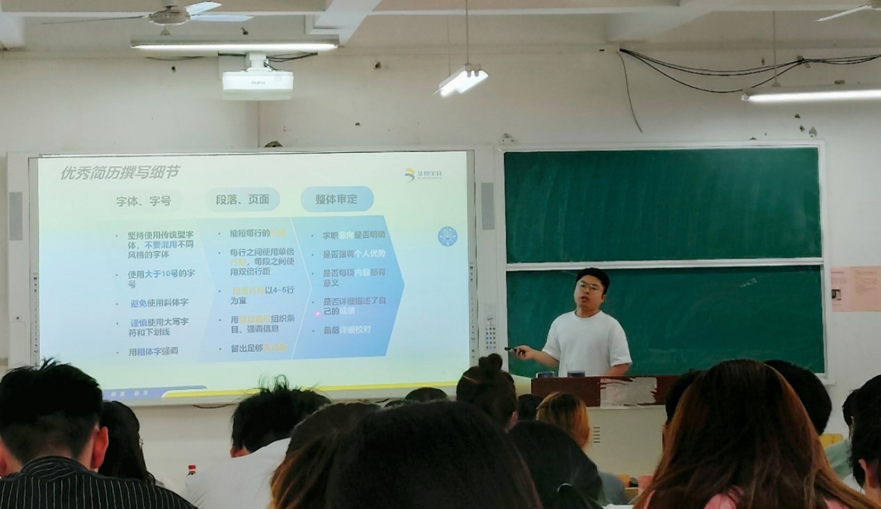 本次系列活动吸引了200余名学生踊跃报名、递交简历,并结合学生需求组织了专题培训。5月25日下午,学院邀请华熙生物科技股份有限公司护肤品生产中心HRBP孙中昱来校为学生做“简历撰写与面试技巧”的培训报告,介绍简历框架、简历撰写要点、面试技巧等,传授求职面试的理论、方法与经验。