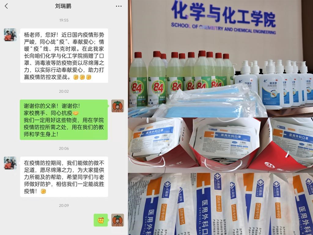 为助力学校做好疫情防控工作,为学院增加防疫物资储备,2019级制药工程本科班学生刘瑞鹏的父亲刘岸清先生向学院捐赠了口罩、免洗手消毒凝胶、84消毒液等防疫物资。“现在学校正处在疫情防控的关键时期,捐献防疫物资、略尽我的绵薄之力,希望为学校疫情防控提供力所能及的帮助”,刘瑞鹏父亲在电话里如是说。这一暖心行为不仅为学院的日常消杀工作提供了物质保障,更为家校共克时艰、携手打赢疫情防控攻坚战传递了精神力量。家长的爱心捐赠既是对学校防疫工作的鼎力支持,更是家校携手、合力育人的充分体现。这样的爱心义举在学院并非第一次。2020年5月,为助力学院疫情防控工作与学生返校复学,2018级应用化学本科班学生国颖的父亲国贤昌先生向学院捐赠了免洗75%酒精消毒液。“我们学生党支部的国颖学姐为学院捐赠消毒液的事情深深触动了我。疫情面前,没有旁观者、没有局外人,作为一名入党积极分子,我应该以优秀的学生党员们为榜样,为守护我们的校园尽自己的一份力量”,刘瑞鹏同学说道。
