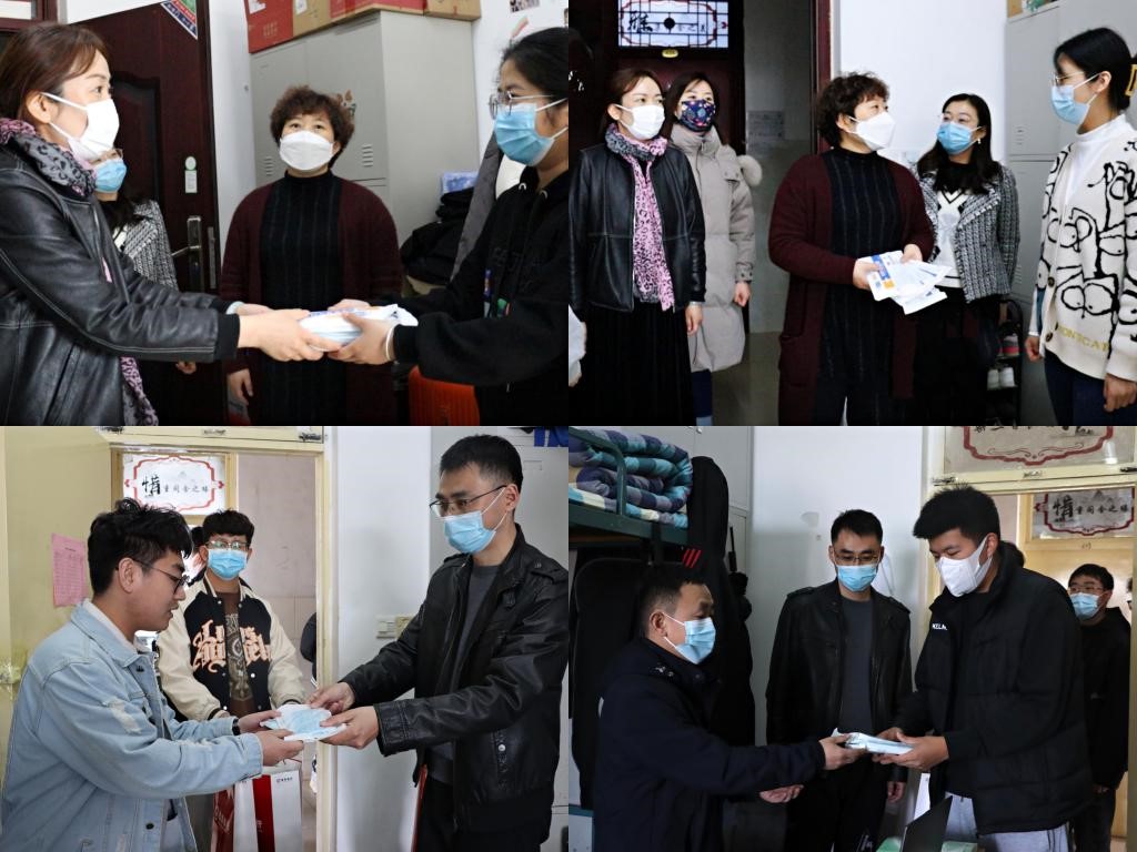 3月23日中午,学院党政领导班子下沉到学生宿舍,为学生分发医用外科口罩,并深切叮嘱同学们要做到戴口罩、勤洗手、常通风;尽快适应网上授课方式,合理安排学习时间;学习之余适当开展体育锻炼,保持良好身心状态。