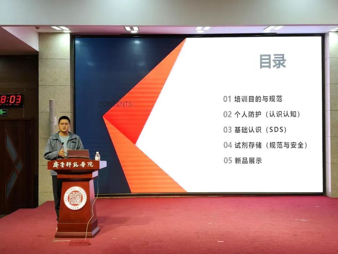 史勇结合近年来高校实验室发生的典型安全事故案例,深入剖析了实验操作中各环节存在的安全隐患及其成因。他系统讲解了安全数据说明书(SDS)的关键信息与查阅方法,介绍了个人防护装备的正确选用要点,并详细阐述了从化学品分类存储到气瓶安全管理的全流程规范,引导学生全面掌握实验室安全基础知识和操作规范。