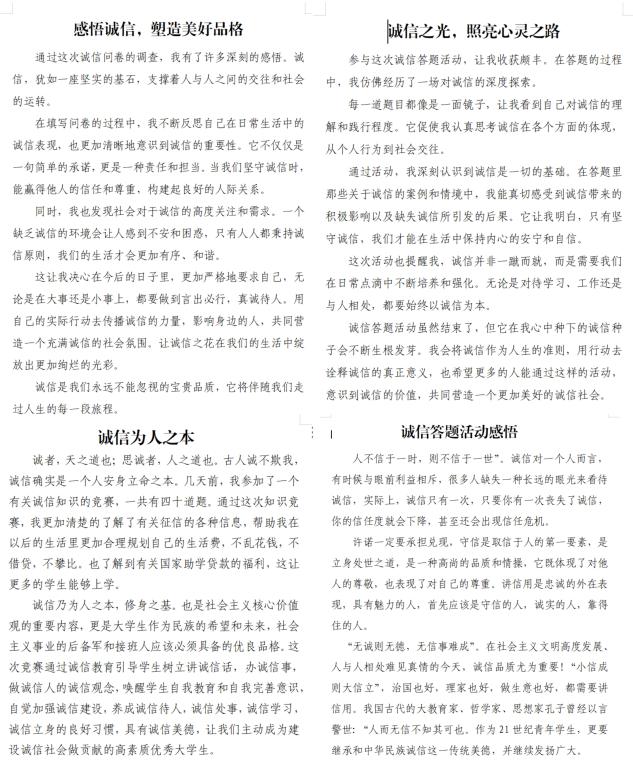 活动结束后,同学们主动将活动感悟记录下来。情感真挚的话语,字里行间洋溢着对国家资助政策的感激。他们表示,诚信是中华民族的传统美德,也是社会主义核心价值观的重要内容,在生活中将会以更加饱满的热情去弘扬诚信美德,促进个人发展和社会和谐,为实现个人梦想和国家发展贡献自己的力量。