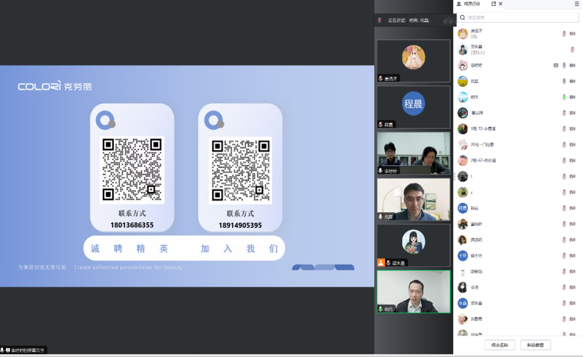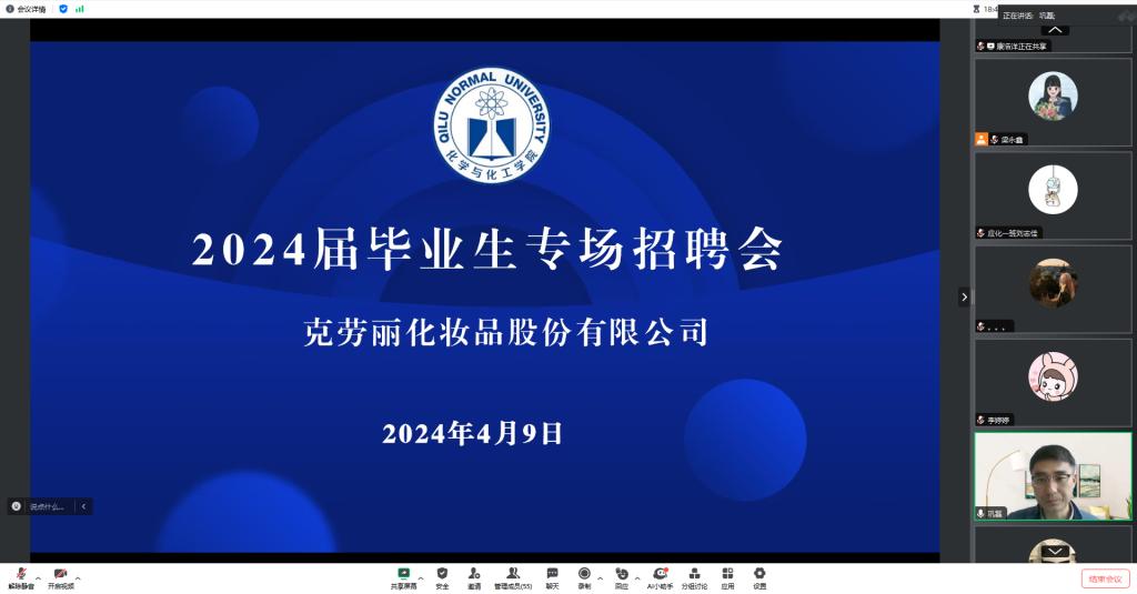 为进一步拓宽毕业生就业渠道,帮助学生了解当前就业形式,搭建毕业生与企业之间沟通的桥梁,4月9日下午学院邀请克劳丽化妆品股份有限公司(苏州)开展线上招聘会。参加本次招聘会的有质量管理中心总监胡添,招聘调配部经理李婷婷,2023届毕业生周明让,学院党委副书记巩磊,化妆品中心主任骆兴伟,辅导员梁永鑫以及2024届毕业生。