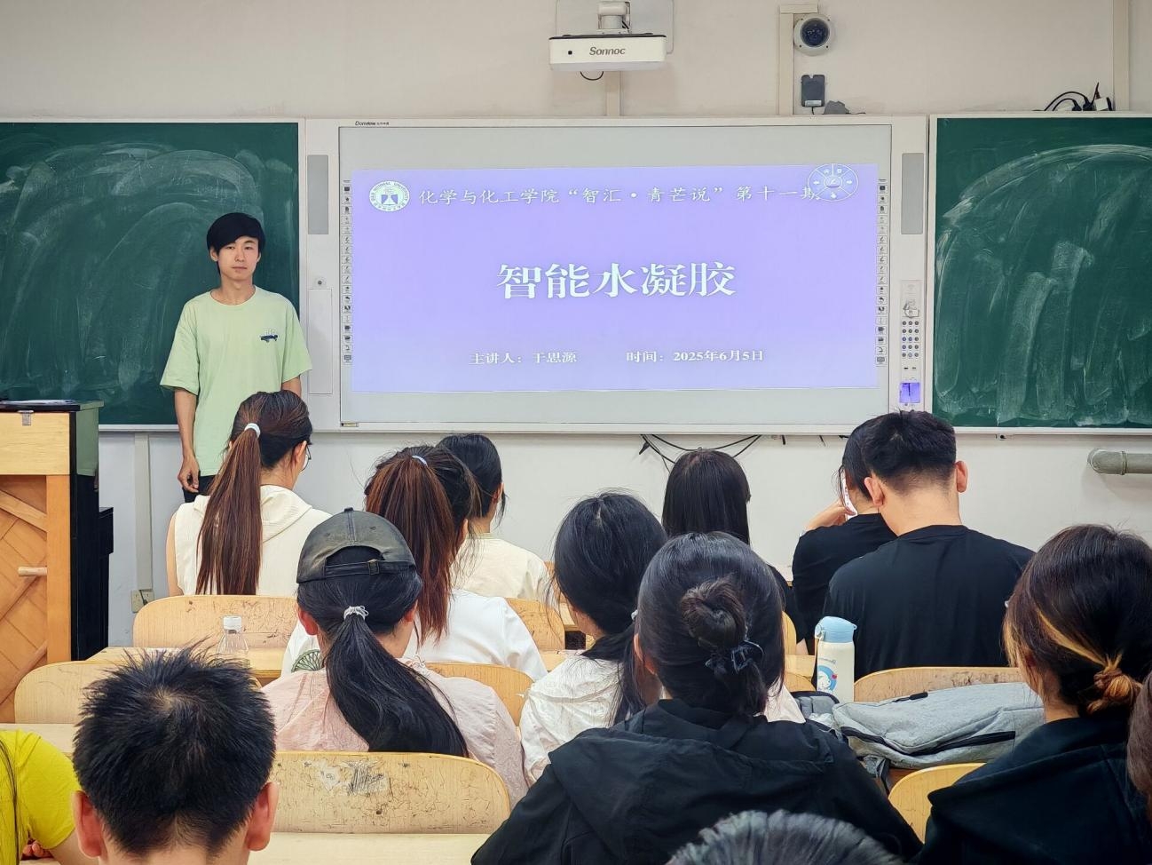 本次学术报告中,于思源聚焦智能水凝胶这一新型功能材料,阐释其由亲水性高分子通过物理或化学交联形成三维溶胀网络,兼具高含水量、亲水性及机械稳定性,凭借对水分子的选择性捕获能力,在生物医学工程、组织修复、环境净化等跨学科领域展现重要价值。报告围绕水凝胶创新制备技术与物理化学特性构效关系,构建了基于组分调控和工艺创新的分类体系,深入解析其在药物靶向递送、智能伤口修复、生物传感等尖端领域的产业化应用进展,系统性搭建起基础研究到实际场景的跨学科知识桥梁。讲座最后,于思源提出希望通过本次分享,启发学生探索智能水凝胶创新应用,为新型功能材料的研究发展提供新思路。