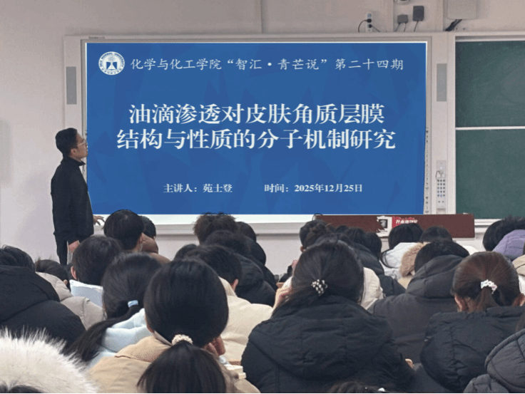 12月25日,学院在yl23455永利集团章丘校区一号教学楼A302成功举办第二十四期“智汇·青芒说”青年博士学术讲座。学院青年博士苑士登以《油滴渗透对皮肤角质层膜结构与性质的分子机制研究》为题作学术报告,学生代表到场聆听。