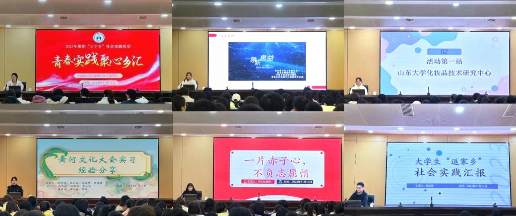 参加暑期“三下乡”社会实践活动的三个代表团队为同学们分享实践内容和经验收获。心乡汇服务队讲述重走红色足迹、追溯历史记忆、访谈英雄后代、感悟黄河文化的经历,增强了同学们的文化自信和爱国情怀。“泉新泉意”泉水文化宣讲团立足于大创项目成果,走进群众、深入基层、躬身实践,实现知识与国产化妆品宣传和济南泉水文化紧密结合,提高同学们泉水保护意识。“追光成炬·化妆品科普社”团队实地调研群众问题,参观学习专业知识,开展趣味宣传活动,将专业知识与科普宣讲相结合,为社区群众科普更多化妆品专业知识,激励同学们将理论知识用于实际,在实践中锤炼自己,以学促干,学以致用。