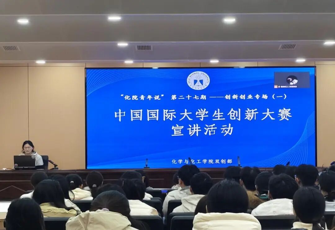 为深入激发学生参加创新创业各类赛事热情,充分挖掘化学学科在高水平赛事中的创新潜力,大力培育具有创新精神、创业意识和实践能力的高素质人才,10月26日下午,学院在第二学术报告厅开展“化院青年说”第二十七期创新创业专场宣讲活动。本次活动聚焦中国国际大学生创新大赛,学院学生会双创部干事秦留洋做赛事介绍,邀请2023级化学(师范类)三班曹荣欣、2024级应用化工技术二班宋宇航做参赛经验分享,2024级精细化工一班范筱煜担任活动主持人。