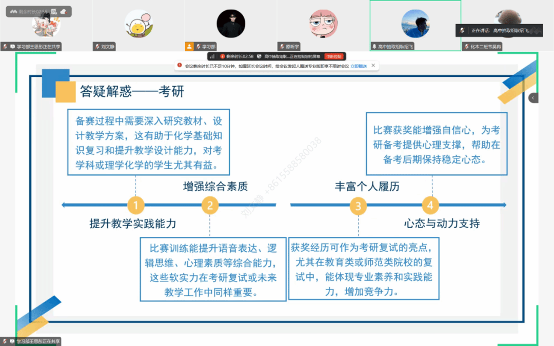 随后,高中化学组选手耿绍飞与张新月结合学科背景与参赛经验进行分享。耿绍飞强调了深耕教材、研读评分标准、注重团队协作等备赛要领,并推荐使用“国家中小学智慧教育平台”等优质资源。张新月详细解读了从院赛到省决赛的完整赛程,建议同学们尽早制定规划。在实战经验环节,她特别指出需注重答辩技巧和板书设计。针对“备赛是否与考研冲突”的疑问,他们一致认为备赛不仅能提升教学能力,还可增强综合素质,对考研和就业具有积极推动作用。