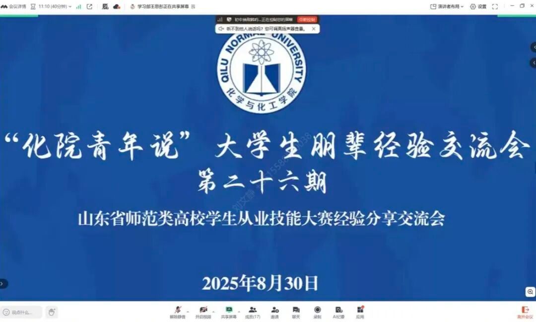 本期“化院青年说”是山东省师范类高校学生从业技能大赛的专场经验分享会。在比赛中荣获佳绩的学长学姐结合亲身经历,分享了参赛心得与实用方法,帮助同学们清晰了解大赛流程,并鼓励2023级师范生积极把握下学期实习机会,主动积累教学实践经验,为今后夯实专业基础、锻炼教学技能做好充分准备。