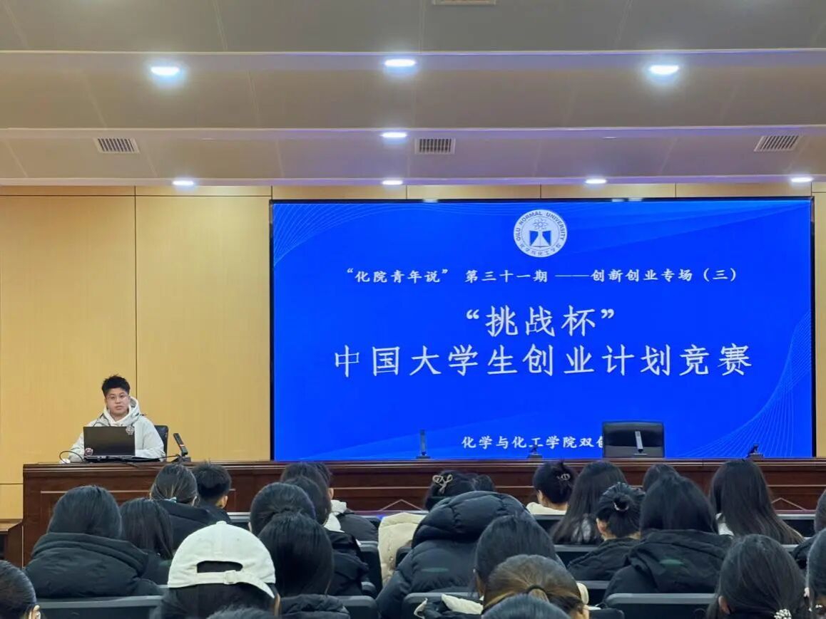 为帮助学生熟悉“挑战杯”、生命科学竞赛赛事要求与规则,提高参赛能力和水平,激发学生投身科技创新的热情,12月26日下午,学院“化院青年说”第三十一期创新创业专场活动在第二学术报告厅顺利举办。本次活动聚焦“挑战杯”全国大学生创业计划竞赛与全国大学生生命科学竞赛两大赛事,由学院双创部干事贺鹏志系统解读赛事规则,2024级制药工程一班徐佳宁分享实战参赛经验,双创部干事秦留洋主持本次活动。