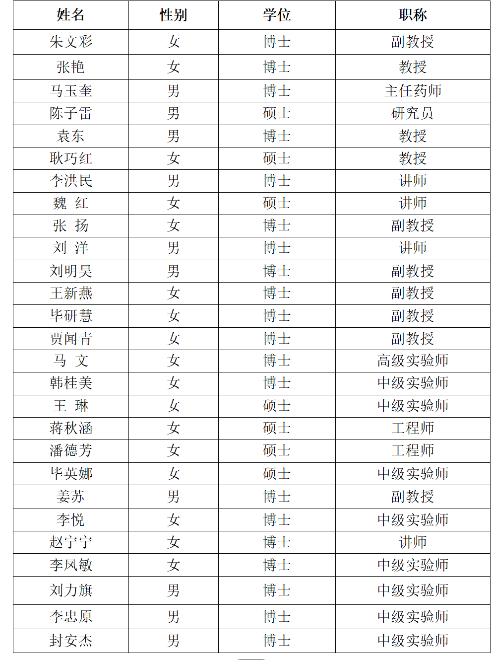 分析化学教研室共有专任教师27人,其中博士20人,硕士7人。目前有正高级职称5人,副高级职称8人,中级职称14人。