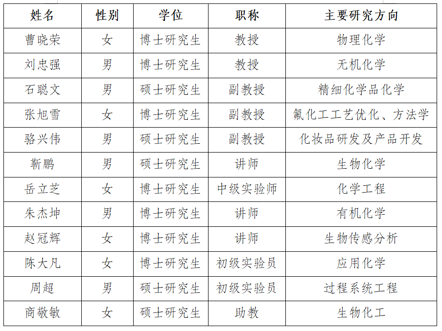 化工教研室由一批学历层次高、教学水平高、科研能力强的中青年教师队伍组成。现有专任教师12人,其中博士9人,硕士3人。目前有正高级职称2人,副高级职称3人,中级职称4人,初级职称3人。