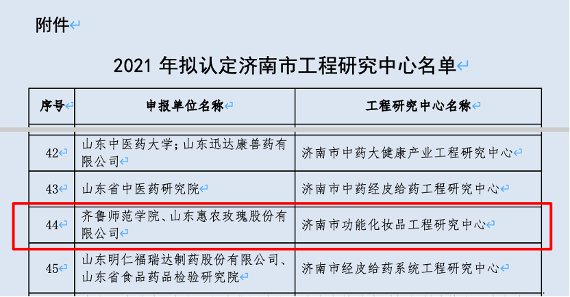 经济南市发展和改革委员会公示,12月15号,yl23455永利集团永利y23455成功获批济南市功能化妆品工程研究中心。“济南市功能化妆品工程研究中心”是省内第一个功能化妆品领域的市级工程研究中心,由yl23455永利集团永利y23455牵头,联合山东惠农玫瑰股份有限公共同建设。中心致力于在功效化妆品原料、工艺、分析评价、信息数据库建设几个方面开展研究。针对化妆品行业发展中的重大关键、共性技术问题,开展研发和成果的工程化、产业化,推动化妆品行业领域的技术进步和产业发展。