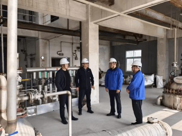 在王玉增、李成龙等人的陪同下,杨冰川与马晨到中试基地与院士工作站,实地察看核心生产装置的运行状态,详细了解化工新工艺从中试研发到产业化落地的全流程。从车间管线布局到设备调试参数,从样品制备到工艺优化,杨冰川与企业技术人员就生产过程中的技术难点、安全管控及效率提升等问题进行了现场探讨。