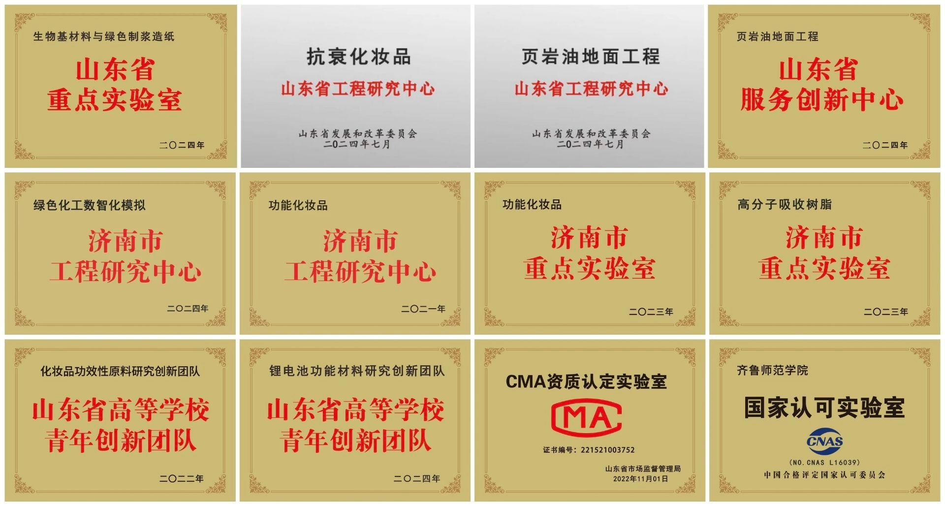 实验室与平台建设:学院拥有功能完善、设施先进、管理合理的实验室,建筑面积约4000m²,大型仪器设备总价值3700余万元。学院形成了以化学新师范教育和应用型新工科人才培养为特色的学科专业建设布局。现有山东省生物基材料与绿色制浆造纸重点实验室、抗衰化妆品山东省工程研究中心、页岩油地面工程山东省工程研究中心、山东省页岩油地面工程服务创新中心4个省级平台,绿色化工数智化模拟济南市工程研究中心、功能化妆品济南市工程研究中心、济南市功能化妆品重点实验室、济南市高分子吸收树脂重点实验室4个市级平台。学院分析检测中心具备非特化妆品备案,化妆品、化妆品原料、生态环境固体废物毒理CMA、CNAS检验检测资质,服务全国57个省市400余家企业。学院平台对所有学生开放,助力学生科研和实践能力的培养。
