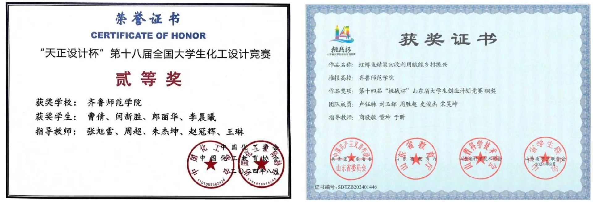 教科研成果:近五年,学院教师主持国家级项目7项,省部级项目30余项,企业委托横向项目100余项,各类项目到账总经费3000余万元。教师发表SCI论文100余篇。现有山东省一流本科课程1门、山东省高等学校在线开放课程1门。学院积极开展第二、第三课堂实践活动,鼓励学生参加各类学科比赛及创新创业项目,提升学生全面素养。学生在全国大学生化学实验创新设计大赛、山东省师范类高校学生从业技能大赛、山东省大学生化学实验技能大赛、“挑战杯”大学生课外学术科技作品竞赛、“挑战杯”山东省大学生创业计划竞赛等比赛中屡获佳绩,学生获国家级大学生创新创业训练计划多项项目立项。2024年,学生参加省级以上各类比赛获奖52项,其中,国家级获奖26项,全国普通高校大学生竞赛目录内获奖13项。