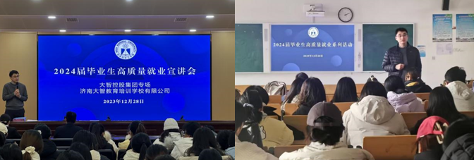 为进一步推进2024届毕业生就业工作,加强学生对当前就业形势的了解,搭建毕业生与企业之间沟通的桥梁,12月28日,学院于二号教学楼A111报告厅、一教A507教室举办2024届毕业生高质量就业宣讲系列活动。参加本次活动的有济南大智教育培训学校有限公司人力资源部贾琦、2013届校友周顺发、学院党委副书记巩磊、辅导员梁永鑫及2024届本科毕业生。宣讲会由巩磊主持。