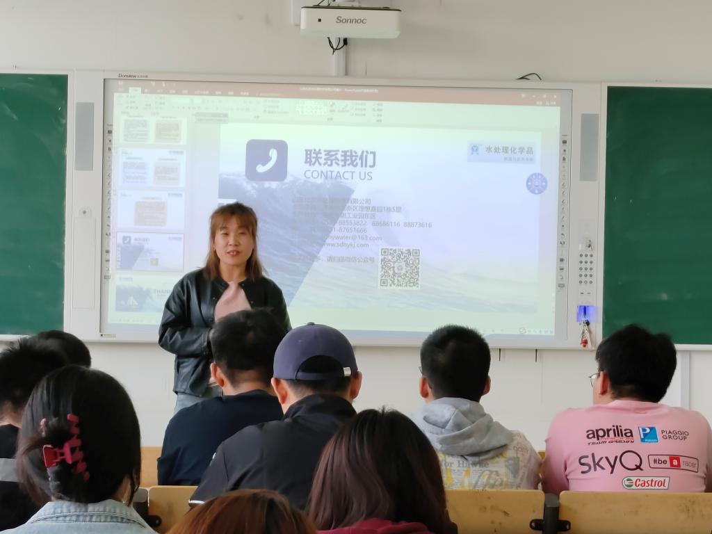 在招聘宣讲会上,山东化友水处理技术有限公司王总通过企业宣讲PPT,向毕业生全面详细地介绍了公司的基本状况、企业文化、各项荣誉资质、技术研发、各类业务板块、主要产品、服务范围、客户展示、人才战略、招聘岗位等方面。在互动环节,王经理针对应届毕业生们提出的问题做出了详细的解答。
