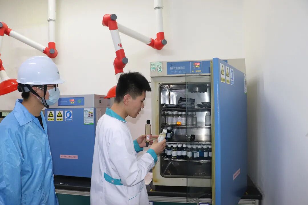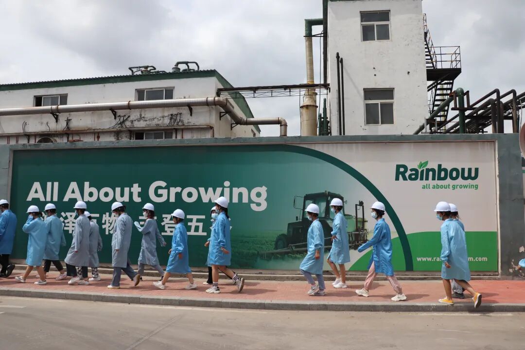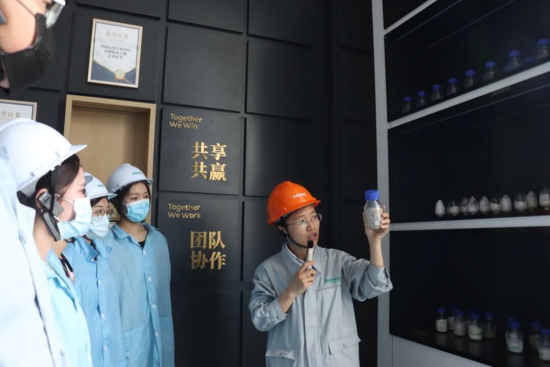 同学们按照工厂的安全标准穿戴好防护用具,一同参观西工厂的成品车间与东工厂的合成车间,了解了除草剂的自动化生产流程、耐热性检验方法以及控制合成反应进程的方式,负责人特别强调销售成品有多种质地,可以根据客户的需求生产不同颜色、不同颗粒大小的产品。