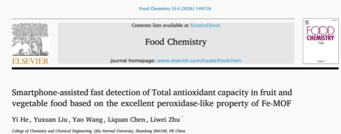 近日,学院生化分析团队在期刊《Food Chemistry》(中科院一区,五年影响因子9.7)发表题为“Smartphone-assisted fast detection of Total antioxidant capacity in fruit and vegetable food based on the excellent peroxidase-like property of Fe-MOF”论文,阐述了一种基于智能手机快速检测果蔬总抗氧量(TAC)的新方法。